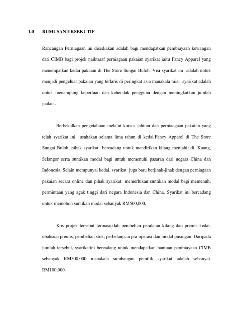 JuRancangan Perniagaan Najuma s Tailor Ogos 2009 Rancangan Perniagaaan Fesyen. Membuka kedai kasut adalah idea yang hampir mati ketika anda tidak mempunyai persekitaran yang sihat dan menyokong untuk. Contoh Rancangan Perniagaan RINGKASAN EKSEKUTIF Rancangan Perniagaan ini disediakan adalah bagi mendapatkan pembiayaan kewangan dari CIMB bagi.